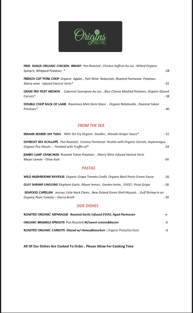 At Origins Bistro, you’ll find a menu that celebrates the best of local flavors with a creative twist. Nestled in the heart of Point Pleasant, NJ, this cozy bistro offers a variety of dishes designed to satisfy every craving. From fresh salads to hearty mains, each plate is thoughtfully crafted with ingredients sourced from the finest local producers. Whether you're in the mood for something light or a bit more indulgent, the Origins Bistro Menu has something to tempt your taste buds. Their innovative takes on classic dishes will leave you coming back for more, making every meal a unique experience. With a warm, inviting atmosphere and a menu that changes with the seasons, this bistro is the perfect spot to enjoy a meal with friends or family.